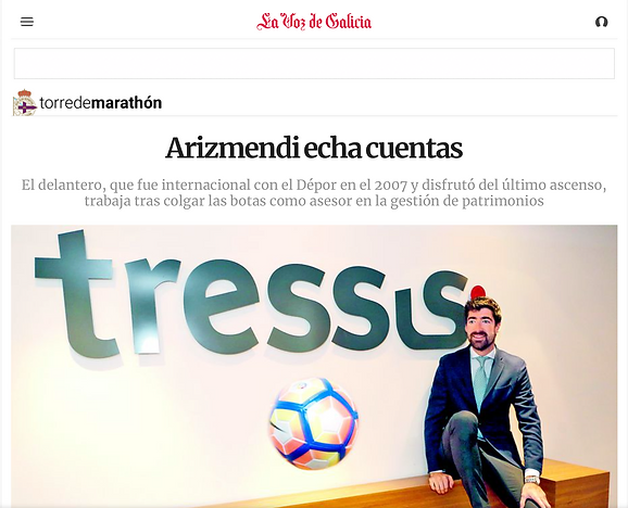 Este es el tercer verano que Javier Arizmendi (Madrid, 1984) no hará pretemporada. Disfrutará de su mes de vacaciones y volverá a Madrid, donde trabaja en Tressis, una sociedad de valores en la que se encarga de asesorar en la gestión de patrimonios. El exfutbolista dio el salto del césped a los despachos, de la mochila a la hucha, al cabo de su segunda etapa como deportivista, después de haber cumplidos todos sus sueños de niño. Había debutado en su equipo de formación, el Atlético de Madrid, y jugó casi 200 partidos en Primera repartidos en las filas de un buen puñado de equipos, entre otros el Santander, el Zaragoza, el Valencia, o el Getafe. En el Dépor llegó a ser internacional, se quedó a las puertas de una final de Copa y, ya en su segunda etapa, volvió para devolverlo a la máxima categoría en el 2014. «Estoy superorgulloso de lo que hice en el fútbol y ahora no tengo pretensiones muy elevadas, simplemente ser una persona confiable y que quien tenga enfrente me identifique como una persona seria y honesta», afirma.